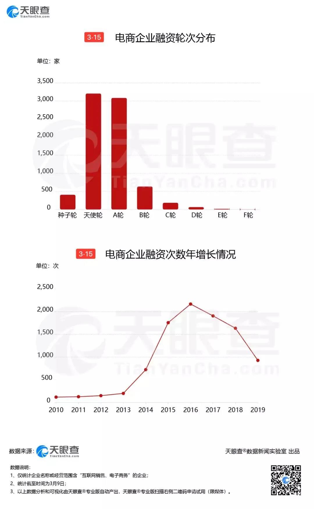 而由于經(jīng)營過程中各種各樣的問題,眾多電商企業(yè)已經(jīng)“犧牲”。截至目前,全國共有43萬家電商企業(yè)顯示注銷或者吊銷,占企業(yè)總數(shù)的近15%,其中約32萬家注銷、吊銷的企業(yè)為創(chuàng)業(yè)型企業(yè)(成立時間小于等于5年)。這些企業(yè)中,不乏一些已有一定實力的企業(yè), 其中超3萬家企業(yè)的注冊資本超過1000萬,357家企業(yè)有公開融資事件。