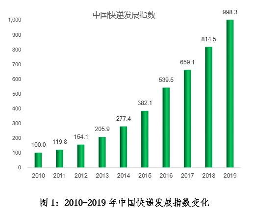 2019年,中國快遞發(fā)展指數(shù)為998.3,同比提高22.6%。從一級指標來看,發(fā)展規(guī)模指數(shù)為2207.1,同比提高25.0%,繼續(xù)保持高速增長態(tài)勢;服務(wù)質(zhì)量指數(shù)為166.0,同比提高24.4%,行業(yè)高質(zhì)量發(fā)展特征明顯;發(fā)展普及指數(shù)為389.0,同比提高3.1%;發(fā)展趨勢指數(shù)為83.2。