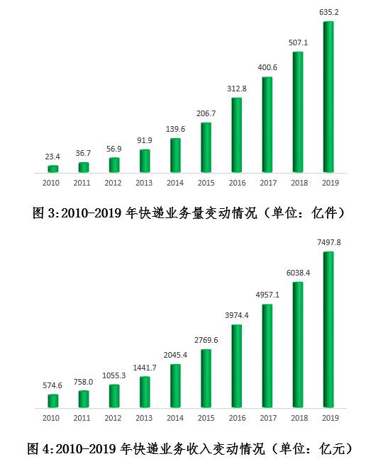 市場規(guī)模中高速增長。2019年,全國快遞企業(yè)日均快件處理量超1.7億件,同比增長25.3%,最高日處理量達5.4億件,同比增長28.5%。全國快遞業(yè)務(wù)量突破600億件,累計完成635.2億件,同比增長25.3%,增量規(guī)模連續(xù)兩年超過100億件??爝f業(yè)務(wù)收入累計完成7497.8億元,同比增長24.2%,量收增速差從去年的4.8%進一步縮小為1.1%,行業(yè)逐漸由規(guī)模單向驅(qū)動向規(guī)模效益雙向驅(qū)動轉(zhuǎn)變。與2010年相比,快遞業(yè)務(wù)量收分別增長了26.1倍和12.0倍,業(yè)務(wù)收入年均復(fù)合增長率是同期國內(nèi)生產(chǎn)總值增速的4倍,成為拉動經(jīng)濟增長的重要動力。