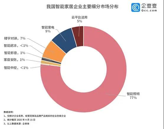 家電不再是冷冰冰的擺設(shè),而是被賦予了審美和情感需求的個(gè)性化智能產(chǎn)品。智能家居作為新興行業(yè),其無接觸式的交互方式,給疫情期間的人民帶來安全、智能的生活體驗(yàn),其優(yōu)勢開始凸顯。企查查整理了我國智能家居企業(yè)八大細(xì)分市場,數(shù)據(jù)表明智能照明、智能家電、樓宇對(duì)講相關(guān)企業(yè)占比較高,分別為77%,9%,7%;此外,家庭安防和智能影音也頗受市場青睞。
